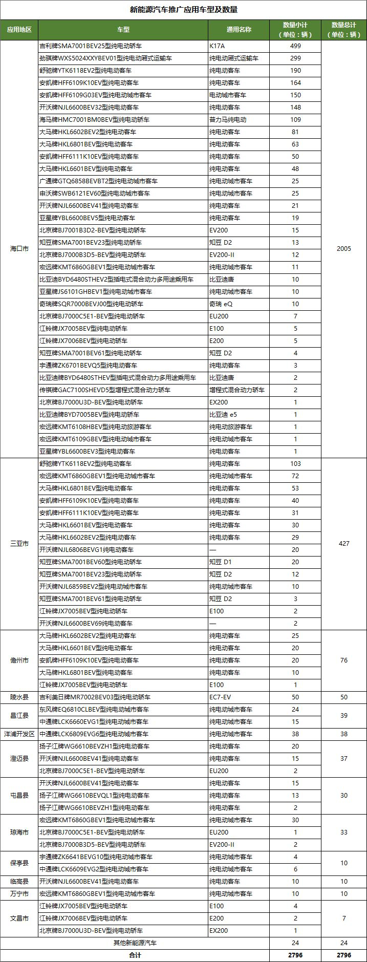 2016年1~12月底海南省电动汽车推广应用车型及数量统计如下: