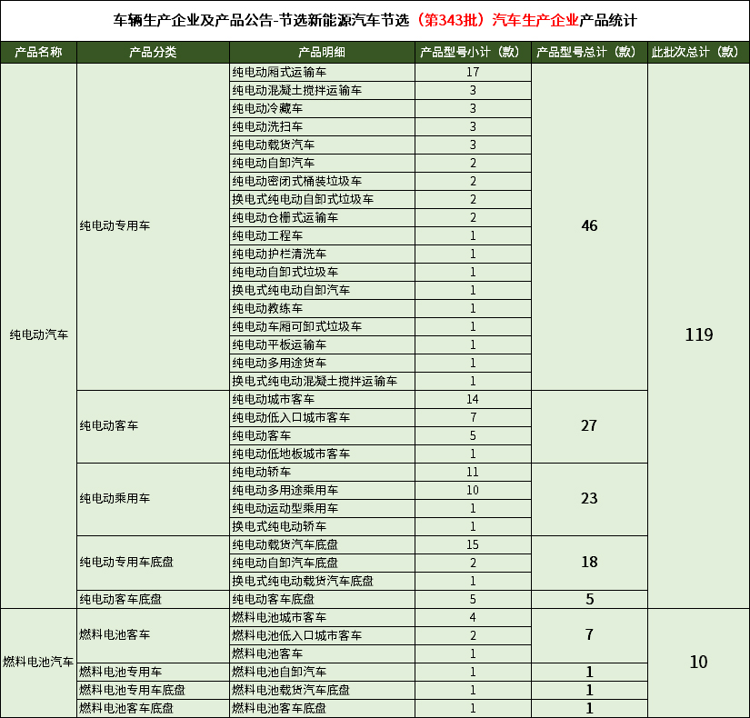 2、燃料种类:本批次纯电动产品共计165款(含乘用车23款、客车31款、专用车88款、客车底盘5款、专用车底盘18款);燃料电池产品11款(含专用车1款、客车8款、客车底盘1款、专用车底盘1款)。