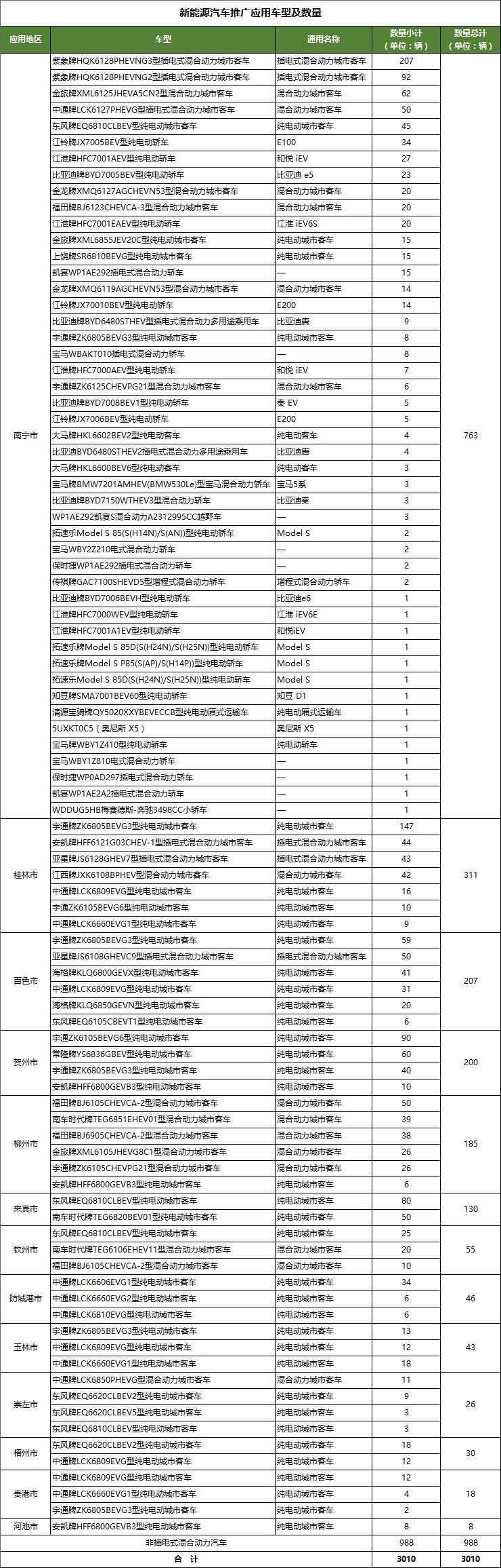 新能源汽车推广应用情况较好的有南宁、柳州、桂林、贺州、百色和来宾等市,其中:
