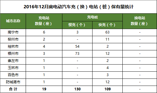 截止12月底,广西电动汽车充(换)电站(桩)保有量详见下表。