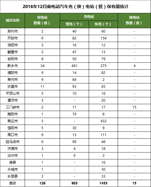 据统计,2016年河南省建成电动汽车充电站126座,换电站15座,充电桩2356个。郑州市、新乡市作为第一批继续开展新能源汽车推广应用城市,新能源推广应用基础设施建设走在河南省的前列。目前,电动公交车充电设施较为完善,使用效率高,其他公共充电桩使用率较低。