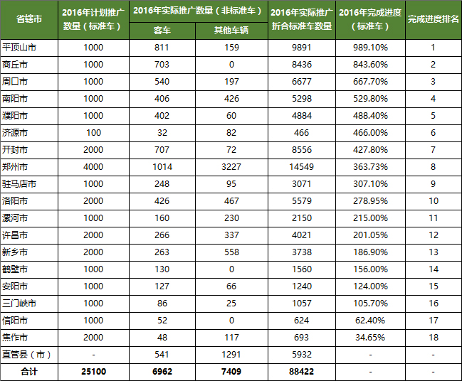 2016年河南省累计推广应用新能源汽车14371辆,折合标准车88422辆,完成国家给河南省下达的推广任务的352%。其中:
