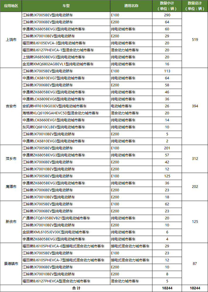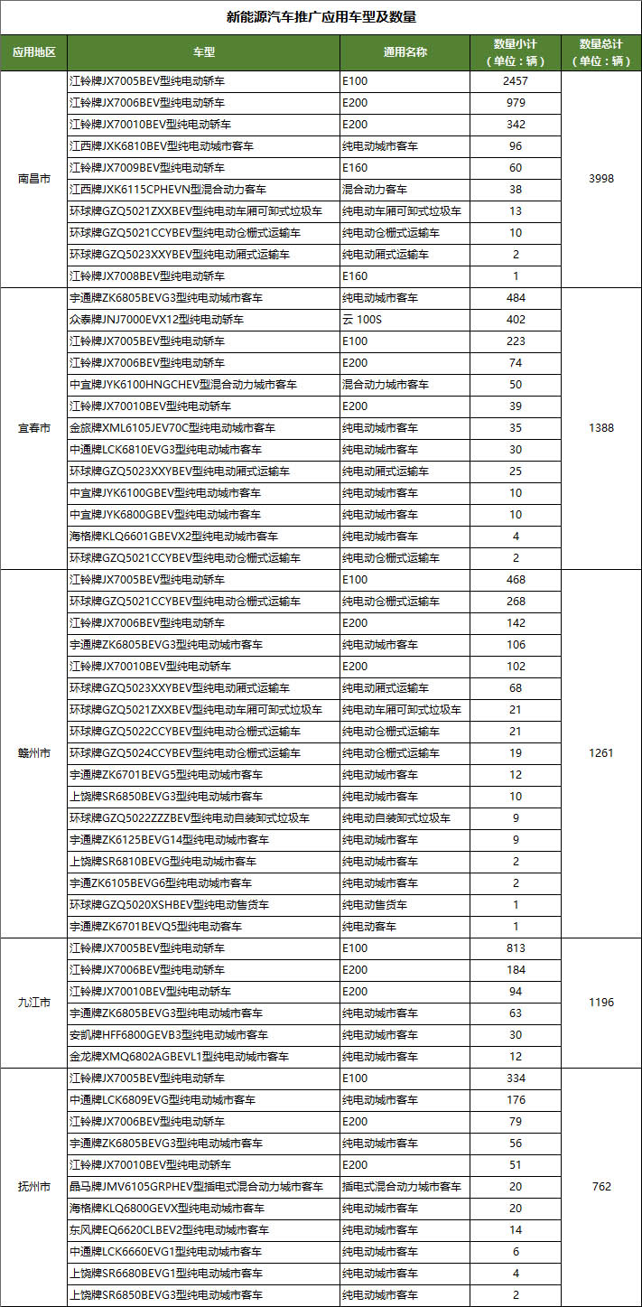 2016年江西省节能与新能源汽车推广应用车型及数量如下所示: