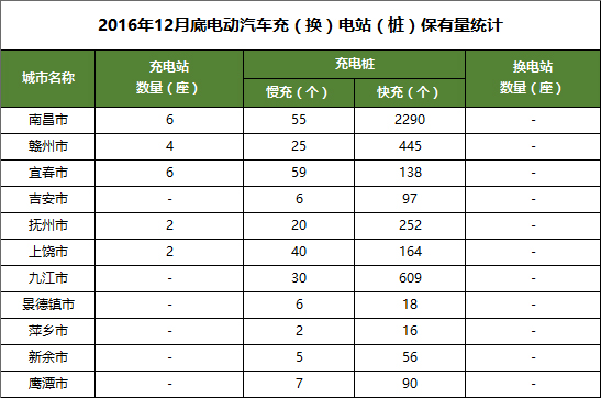 新能源汽车充电基础设施以南昌、赣州、九江、宜春发展最为迅速,在这些城市建立新能源汽车充电示范点。大力发展城市公交专用充电设施、高速服务区快充设施,推动江西省充电基础设施建设。全年共建成充电桩4430个(其中直流快充桩4175个,交流慢充桩255个),充电站20座,2016年充电桩建设数量是前三年的2.9倍。