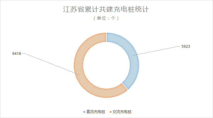 江苏省累计建设充电桩15341个,其中直流桩5923个,交流桩9418个。