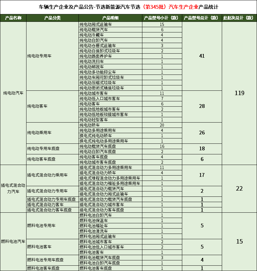 2021年7月13日,工业和信息化部公告了《道路机动车辆生产企业及产品(第345批)》,依据同一型号判定原则归纳后,通过技术审查的新能源汽车产品共计199个。