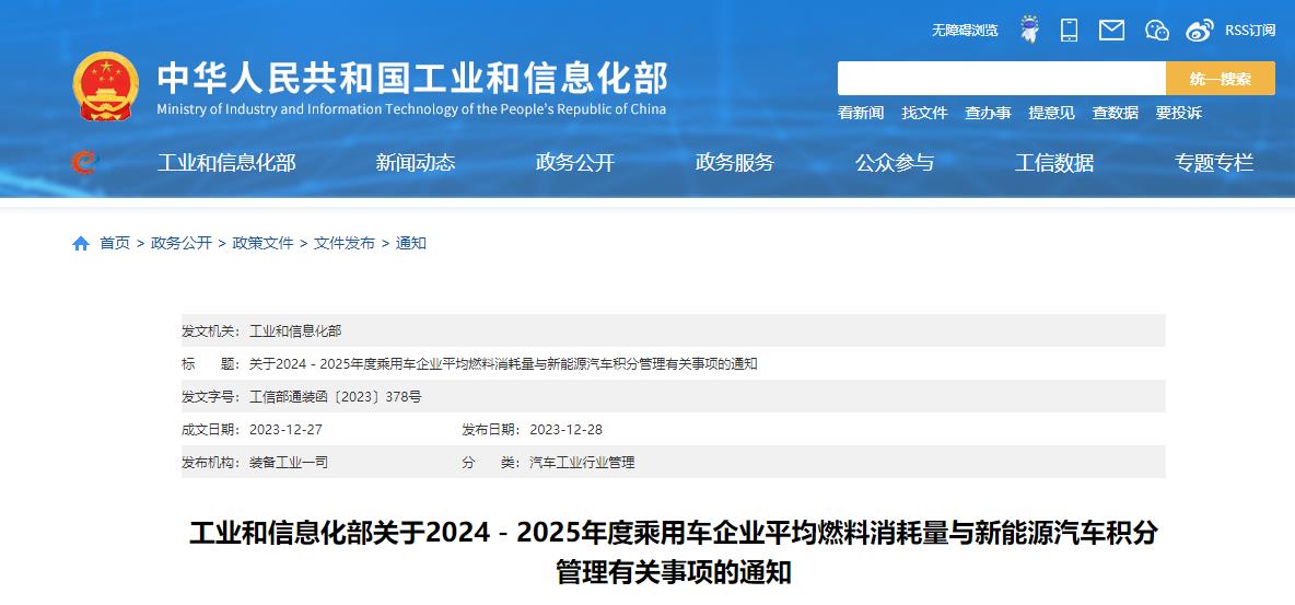 2023年12月28日,工业和信息化部发布《关于2024—2025年度乘用车企业平均燃料消耗量与新能源汽车积分管理有关事项的通知》(以下简称《通知》)。《通知》明确: