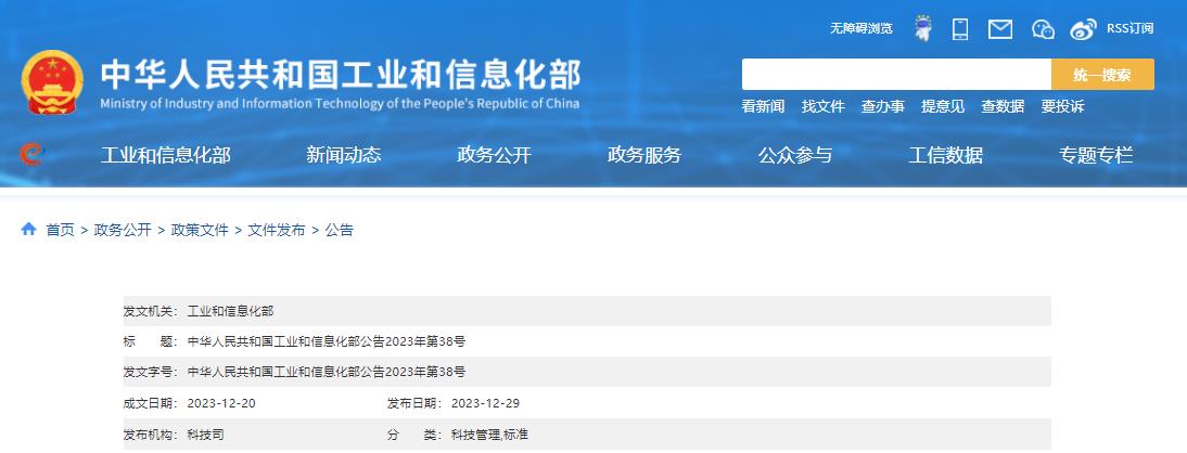 中华人民共和国工业和信息化部公告