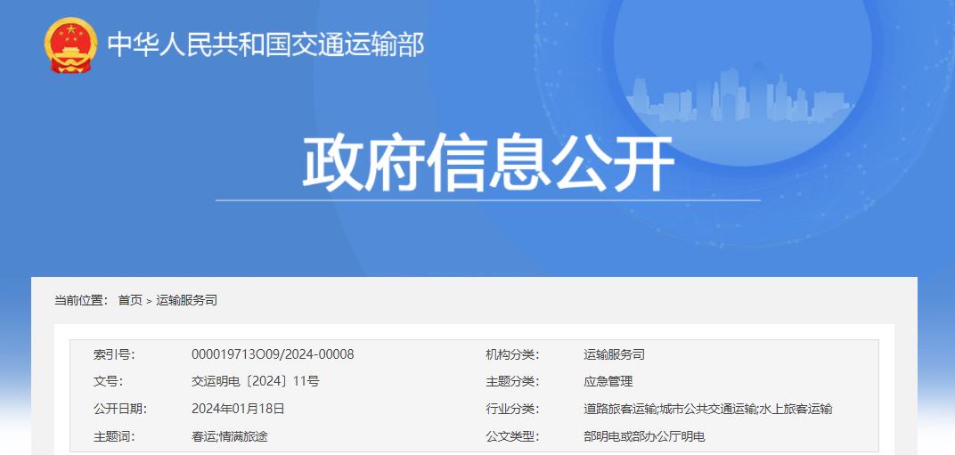 为进一步提升春运服务质量和水平,交通运输部、公安部、应急管理部、中华全国总工会、共青团中央决定,在2024年春运期间联合组织开展“情满旅途”活动。现将有关事项通知如下:
