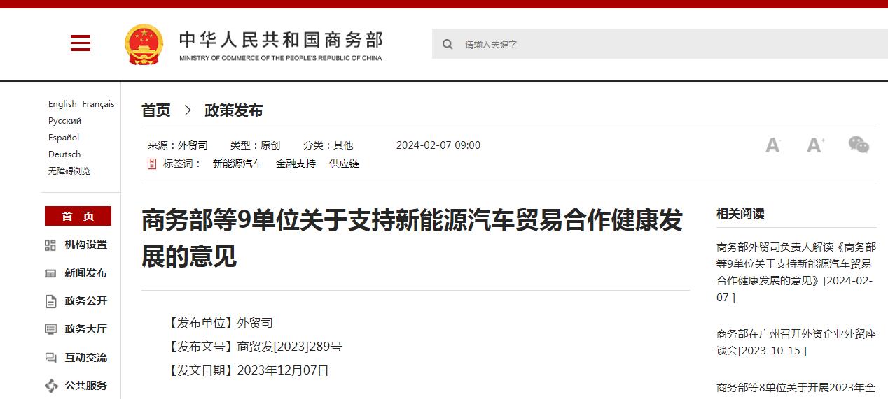 2024年2月7日,商务部、国家发改委、工信部、财政部、交通部、央行、海关总署、市场监管总局、金融监管总局九单位联合发布《关于支持新能源汽车贸易合作健康发展的意见》。《意见》明确:从国际化经营能力和水平、国际物流体系、金融支持、贸易促进活动、贸易环境、风险防范能力七个方面支持新能源汽车贸易合作健康发展。