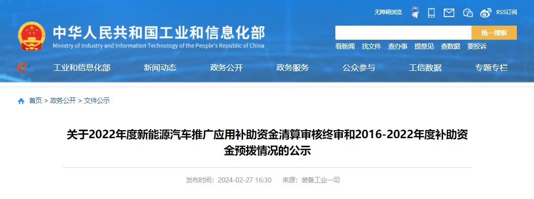工信部:关于2022年度新能源汽车推广应用补助资金清算审核终审和2016-2022年度补助资金预拨情况的公示