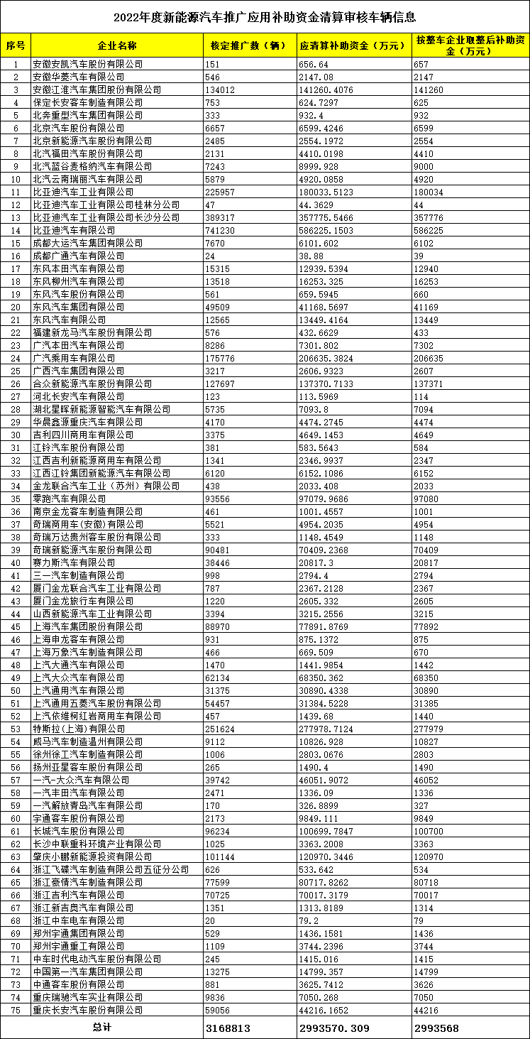 共计75家车企,核定推广数总计3168813辆,应清算补助资金总计2993570.309万元,按整车企业取整后补助资金总计2993568万元。