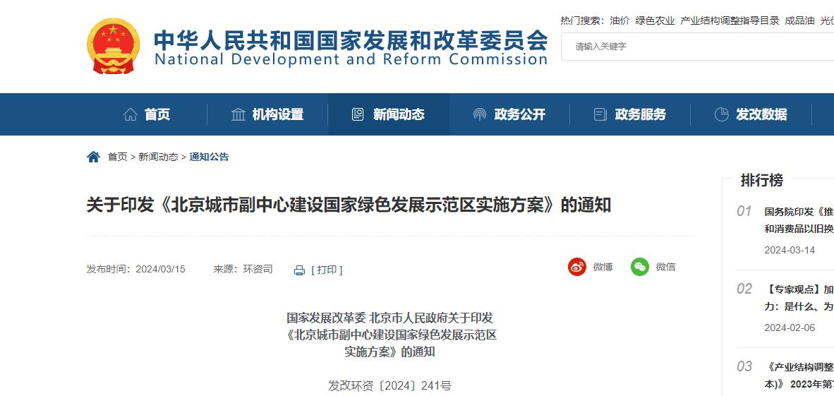 国家发展改革委 北京市人民政府关于印发《北京城市副中心建设国家绿色发展示范区实施方案》的通知