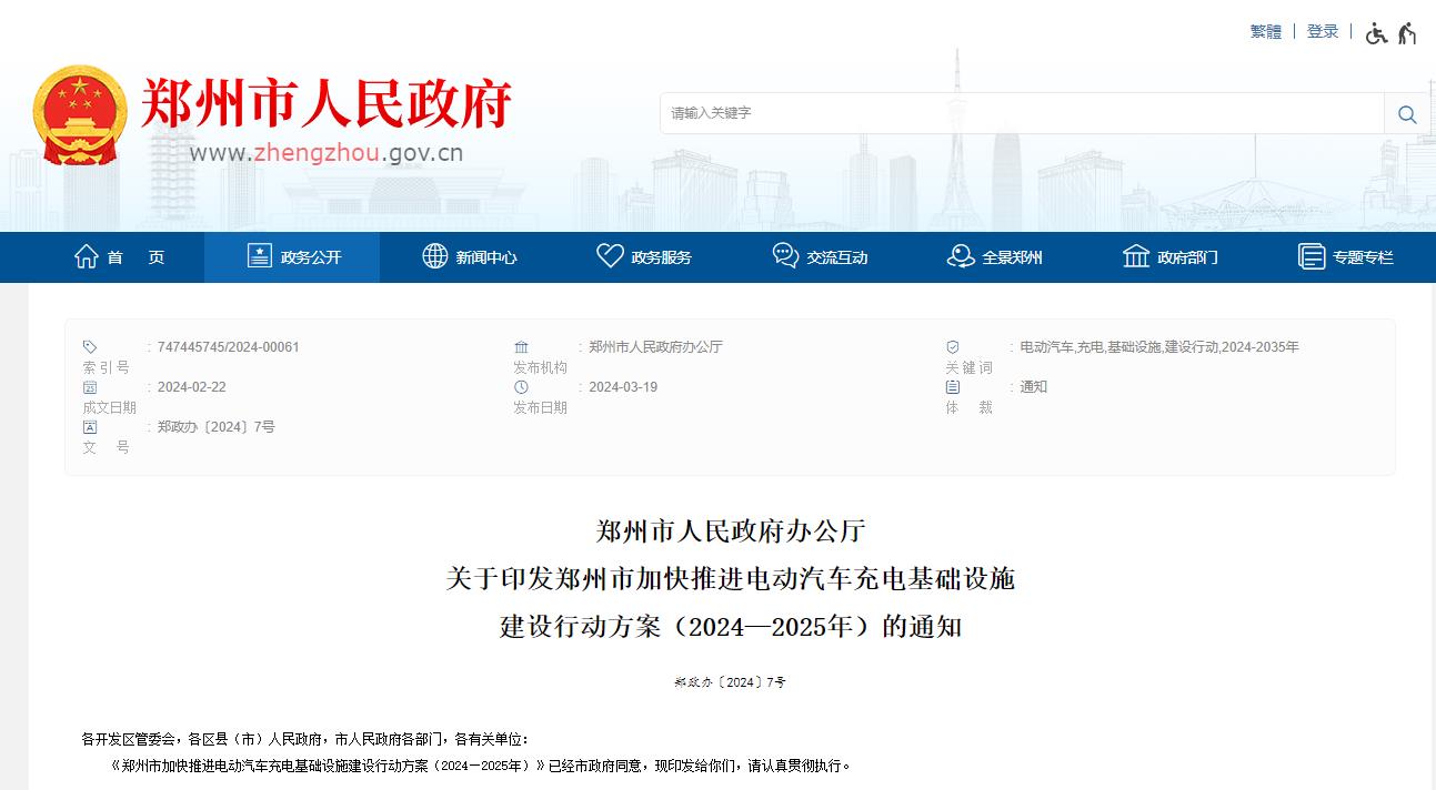 2024年3月19日,郑州市人民政府办公厅发布《郑州市加快推进电动汽车充电基础设施建设行动方案(2024—2025年)》。