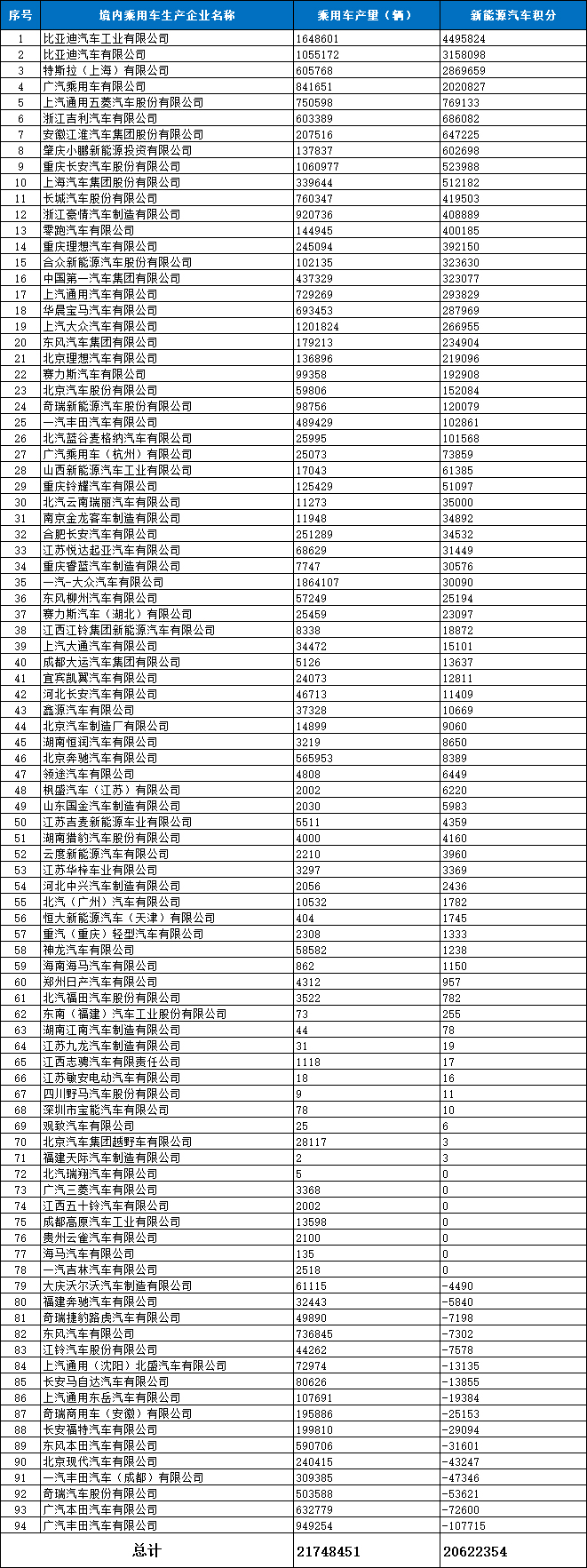 1)境内乘用车生产企业共 94家,乘用车产量共 21748451辆,新能源汽车积分共 20622354分,其中,74家境内乘用车生产企业2023年度新能源汽车正积分:21111513分,16家境内乘用车生产企业2023年度新能源汽车负积分:-489159分,7家境内乘用车生产企业2023年度新能源汽车积分:0分。新能源汽车积分前三的境内乘用车生产企业是:比亚迪汽车工业有限公司、比亚迪汽车有限公司、特斯拉(上海)有限公司,新能源汽车积分分别为:4495824、3158098、2869659。