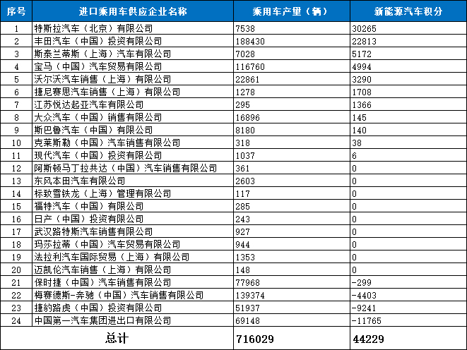 2)进口乘用车供应企业共24家,乘用车产量共 716029辆,新能源汽车积分共 44229分,其中,11家进口乘用车供应企业2023年度新能源汽车正积分:69937分,4家进口乘用车供应企业2023年度新能源汽车负积分:-25708分,9家进口乘用车供应企业2023年度新能源汽车积分:0分。新能源汽车积分前三的进口乘用车供应企业是:特斯拉汽车(北京)有限公司、丰田汽车(中国)投资有限公司、斯泰兰蒂斯(上海)汽车有限公司,新能源汽车积分分别为:30265、22813、5172。