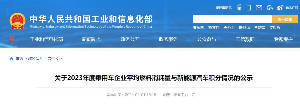 2024年4月1日,工业和信息化部装备工业一司发布《关于2023年度乘用车企业平均燃料消耗量与新能源汽车积分情况的公示》,《公示》显示: