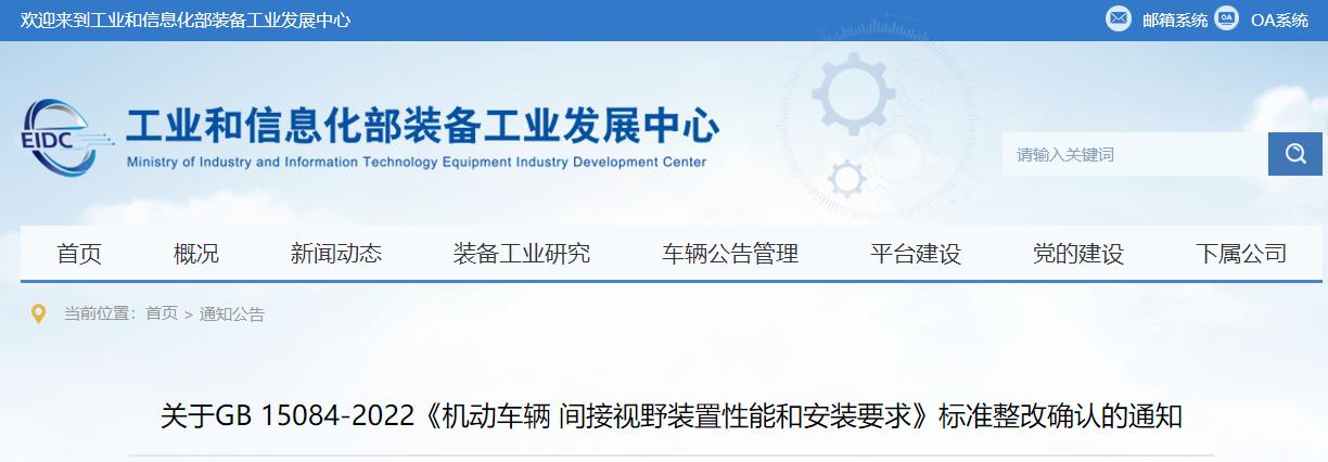 工信部装备中心:关于GB 15084-2022《机动车辆 间接视野装置性能和安装要求》标准整改确认的通知