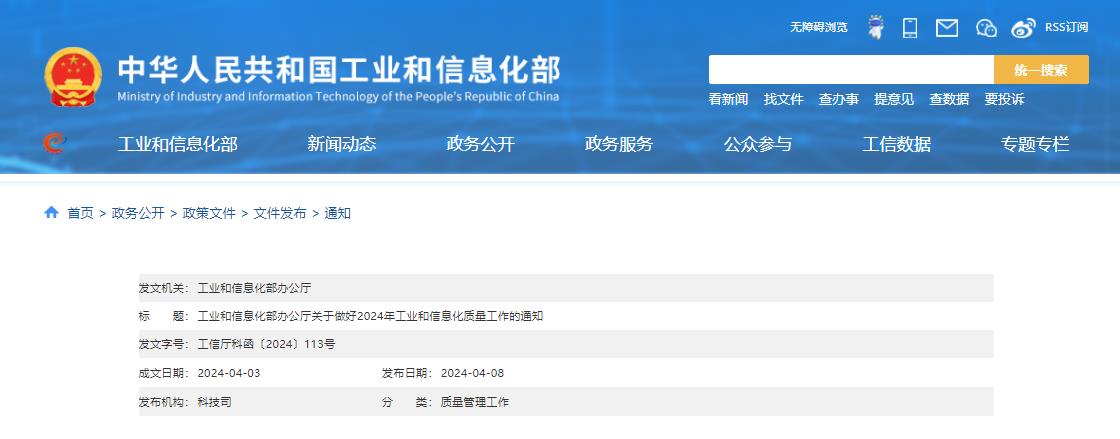 工业和信息化部办公厅关于做好2024年工业和信息化质量工作的通知