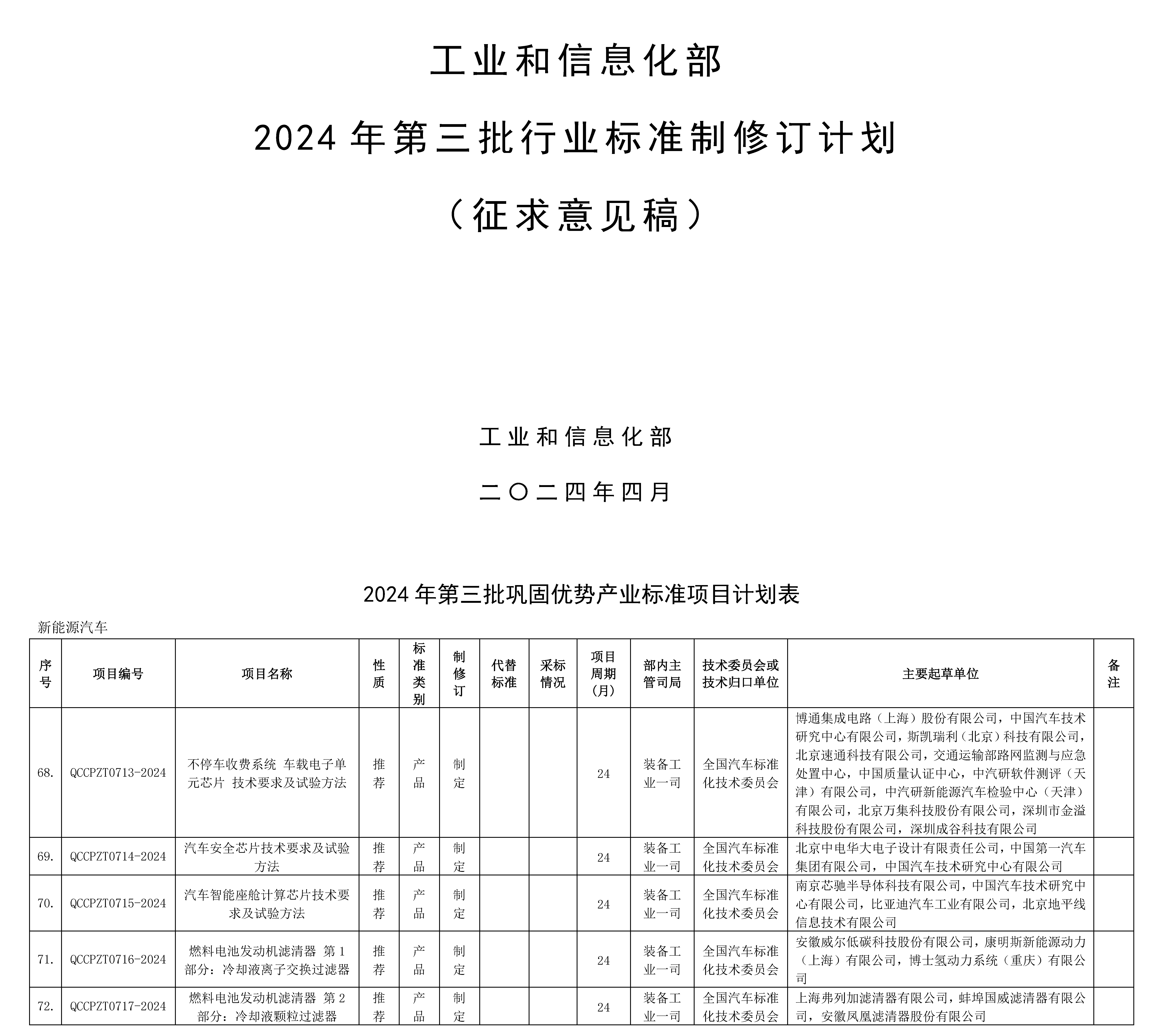 根据我部标准化工作的总体安排,现将申请立项的《乘用车电动助力转向系统性能匹配技术要求及试验方法》等153项行业标准、《粗碳酸钴》等8项行业标准外文版项目和《工业互联网平台 基于工业互联网的工业企业碳管理通用要求》等6项推荐性国家标准计划项目予以公示(见附件1、2、3),截止日期为2024年5月7日。如对拟立项标准项目有不同意见,请在公示期间填写《标准立项反馈意见表》(见附件4)并反馈至我司,电子邮件发送至KJBZ@miit.gov.cn(邮件主题注明:标准立项公示反馈)。