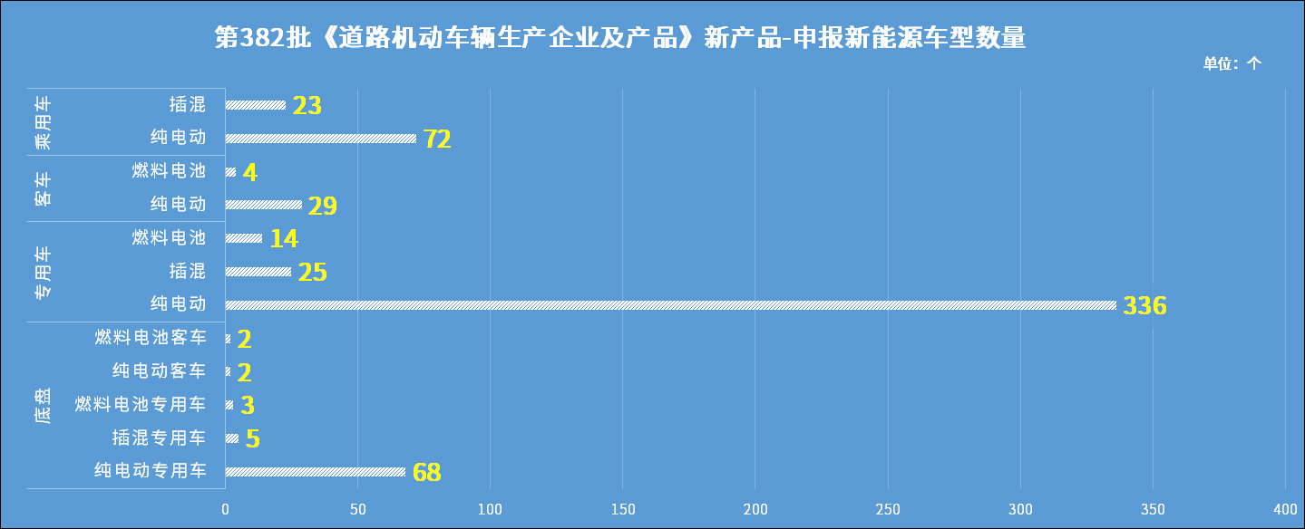 2024年4月15日,工业和信息化部公示申报的第382批《道路机动车辆生产企业及产品公告》新产品。经统计,申报新能源汽车产品的共有169家企业的583个型号,其中纯电动产品共157家企业507个型号、插电式混合动力产品共31家企业53个型号、燃料电池产品共10家企业23个型号。