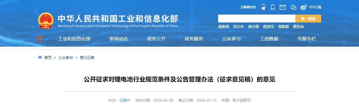 为进一步加强锂离子电池行业管理,促进行业高质量发展,工业和信息化部电子信息司对《锂离子电池行业规范条件(2021年本)》《锂离子电池行业规范公告管理办法(2021年本)》进行修订,形成《锂电池行业规范条件(2024年本)》《锂电池行业规范公告管理办法(2024年本)》(征求意见稿),现公开征求意见。如有意见或建议,请于2024年5月13日前反馈至工业和信息化部电子信息司。