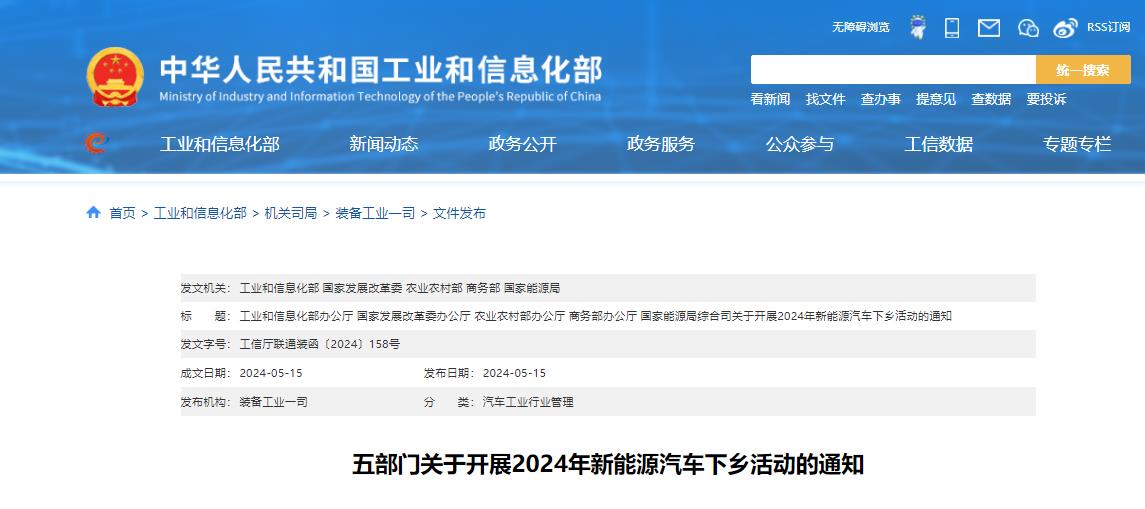2024年5月15日,工业和信息化部办公厅 国家发展改革委办公厅 农业农村部办公厅 商务部办公厅 国家能源局综合司联合发布《关于开展2024年新能源汽车下乡活动的通知》,活动时间为2024年5月—12月;活动内容为:选取适宜农村市场、口碑较好、质量可靠的新能源汽车车型,开展集中展览展示、试乘试驾等活动,丰富消费体验,提供多样化选择。组织充换电服务,新能源汽车承保、理赔、信贷等金融服务,以及维保等售后服务协同下乡,补齐农村地区配套环境短板。落实汽车以旧换新、县域充换电设施补短板等支持政策,将“真金白银”的优惠直达消费者。