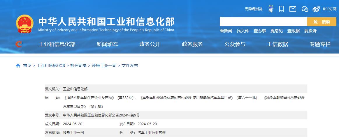 《道路机动车辆生产企业及产品》(第382批)、《享受车船税减免优惠的节约能源 使用新能源汽车车型目录》(第六十一批)、《减免车辆购置税的新能源汽车车型目录》(第五批)