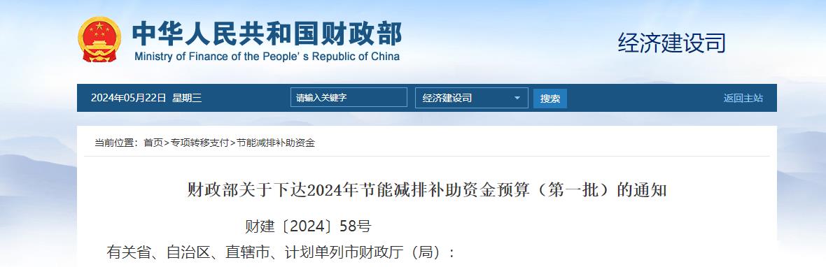 财政部:关于下达2024年节能减排补助资金预算(第一批)的通知