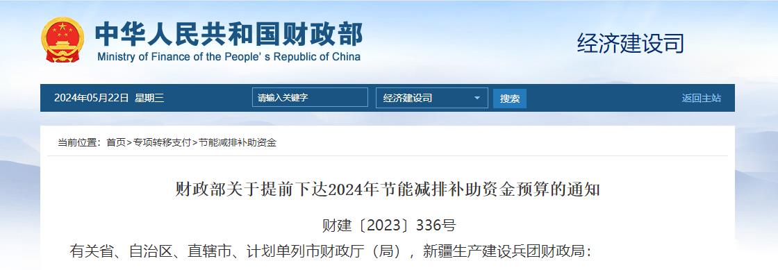 财政部关于提前下达2024年节能减排补助资金预算的通知