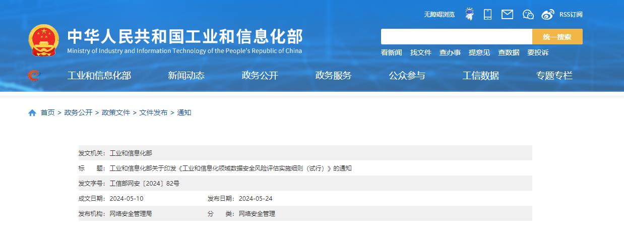 2024年5月24日,工业和信息化部印发《工业和信息化领域数据安全风险评估实施细则(试行)》。《细则》明确:重要数据和核心数据处理者按照国家法律法规、行业监管部门有关规定以及评估标准,对数据处理活动的目的和方式、业务场景、安全保障措施、风险影响等要素,开展数据安全风险评估,重点评估以下内容: