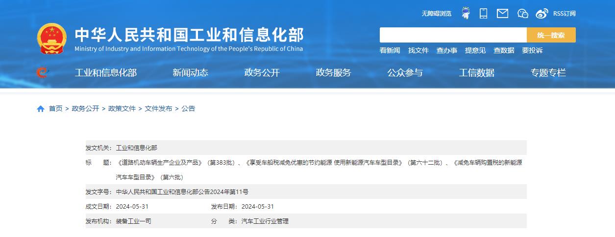 《道路机动车辆生产企业及产品》(第383批)、《享受车船税减免优惠的节约能源 使用新能源汽车车型目录》(第六十二批)、《减免车辆购置税的新能源汽车车型目录》(第六批)