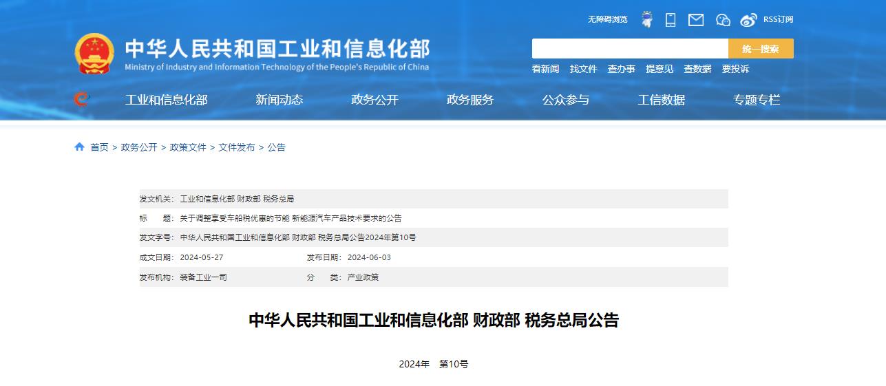 2024年6月3日,工业和信息化部、财政部、税务总局联合发布《关于调整享受车船税优惠的节能 新能源汽车产品技术要求的公告》,关于新能源汽车产品技术要求方面,《公告》明确: