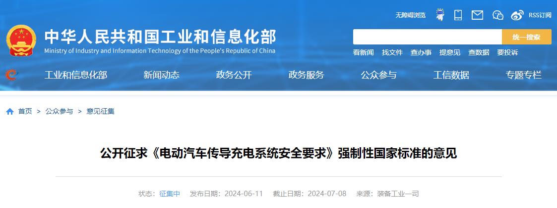 2024年6月11日,工业和信息化部装备工业一司公开征求《电动汽车传导充电系统安全要求》强制性国家标准的意见。