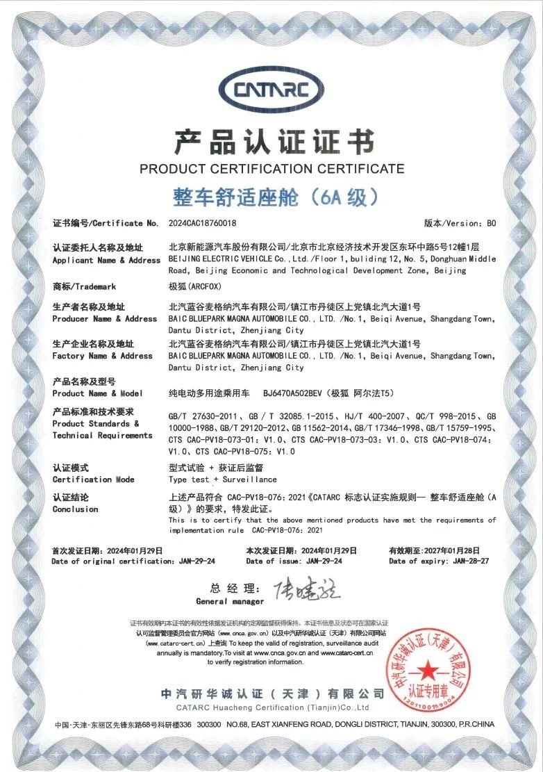 阿尔法T5获舒适座舱6A认证,极狐是懂舒适的