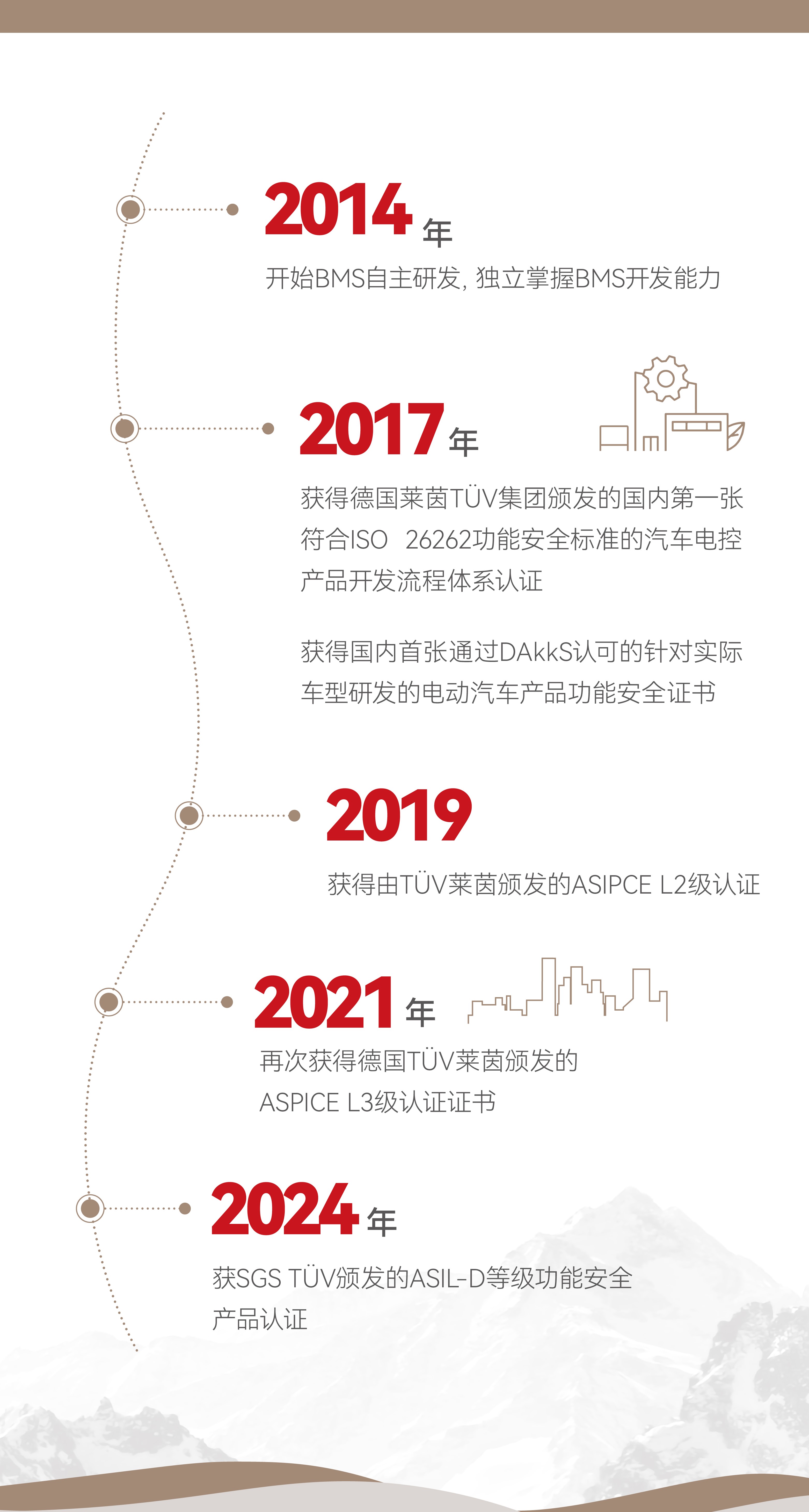 北汽新能源启动功能安全研究较早,早在2014年便开始BMS自主研发,独立掌握BMS开发能力。2017年获得德国TÜV莱茵集团颁发的国内第一张符合ISO 26262功能安全标准的汽车电控产品开发流程体系认证。并于同年获得国内首张通过DAkkS权威机构认可的针对实际车型研发的电动汽车产品功能安全证书,涵盖电池管理系统(BMS)、电机控制器(MCU)和整车控制器(VCU),是国内首家完整动力系统功能安全开发的产品证书,安全目标达到ASIL-C等级。2019年获得由TUV莱茵颁发的ASIPCE L2级认证。2021年再次获得德国TÜV莱茵颁发的ASPICE L3级认证证书,该等级为目前国内汽车行业在ASPICE认证上取得的最高评级,代表了国内汽车软件开发能力的最高水平。今年又获SGS TÜV颁发的ASIL-D等级功能安全产品认证,数次国际公认权威标准的认证,无疑不标志着北汽新能源在功能安全、软件开发等方面均已处于行业领先水平。