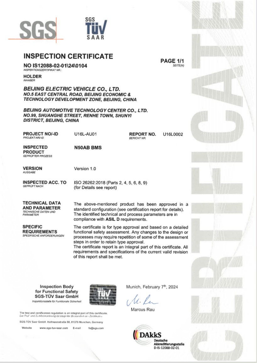 2024年2月7日,北汽新能源自主开发的第四代电池管理系统(BMS)获得SGS TÜV颁发的ASIL-D等级功能安全产品认证。该等级(ASIL-D)为ISO 26262《道路车辆功能安全》国际标准的最高等级,要求也最为严苛。再次取得国际公认权威标准的认证标志着北汽新能源在功能安全方面已处于行业领先水平,并始终将用户的安全放在首位,为用户带来更加安全的用车体验。