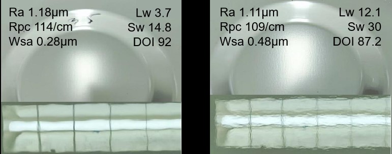 随着汽车工艺绿色环保、低碳、节能减排要求的提高,越来越多的汽车厂开始应用水性免中涂涂装工艺,然而,与传统涂装工艺相比,水性免中涂工艺下漆膜厚度减薄15%以上,对零件表面缺陷的遮盖力降低,车身漆膜外观质量显著下降。由于汽车钢板冲压后的表面轮廓起伏会加剧,容易导致免中涂工艺的车身漆膜桔皮值显著增大,鲜映性指标DOI值下降,目视感知表面质量下降。因此,免中涂工艺对车身钢板的表面质量提出了更加严苛的要求。