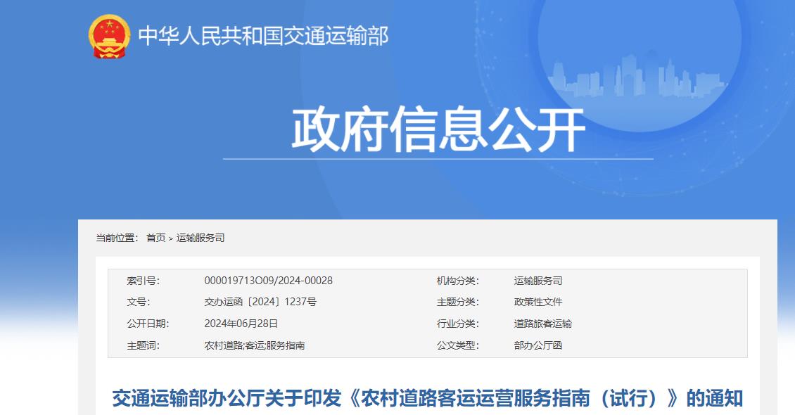 2024年6月28日,交通运输部办公厅印发《农村道路客运运营服务指南(试行)》,《指南》明确:农村道路客运车辆符合《道路运输车辆技术管理规定》有关要求,取得合法有效的《道路运输证》。农村道路客运经营者在农村客货邮合作线路上运行的车辆宜选用符合农村客货邮融合发展适配车辆选型技术要求的客车。鼓励具备条件的地区统一农村道路客运车辆选型、统一车身标识,推广使用新能源、清洁能源等节能环保车辆。