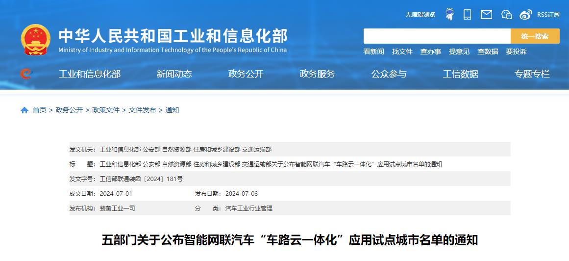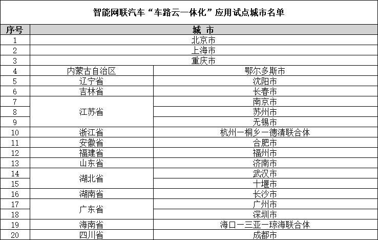 2024年7月3日,工业和信息化部、公安部、自然资源部、住房和城乡建设部、交通运输部联合公布《智能网联汽车“车路云一体化”应用试点城市名单》,北京、上海、重庆等20个城市列入。
