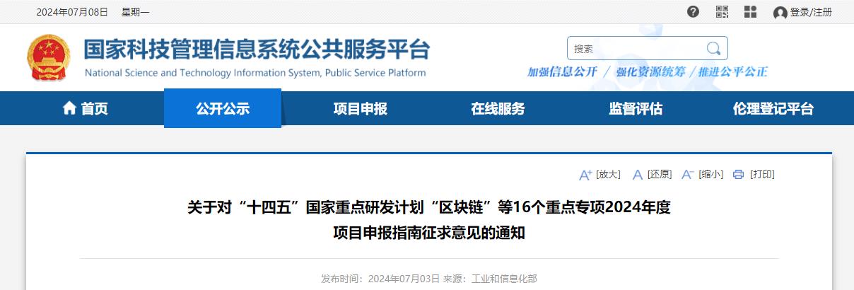 2024年7月3日,工业和信息化部发布《关于对“十四五”国家重点研发计划“区块链”等16个重点专项2024年度项目申报指南征求意见的通知》,对国家重点研发计划区块链、信息光子技术、多模态网络与通信、微纳电子技术、先进计算与新兴软件、智能机器人、智能传感器、高性能制造技术与重大装备、工业软件、增材制造与激光制造、稀土新材料、新型显示与战略性电子材料、先进结构与复合材料、高端功能与智能材料、新能源汽车、基础科研条件与重大科学仪器设备研发16个重点专项2024年度项目申报指南公开征求意见和建议。