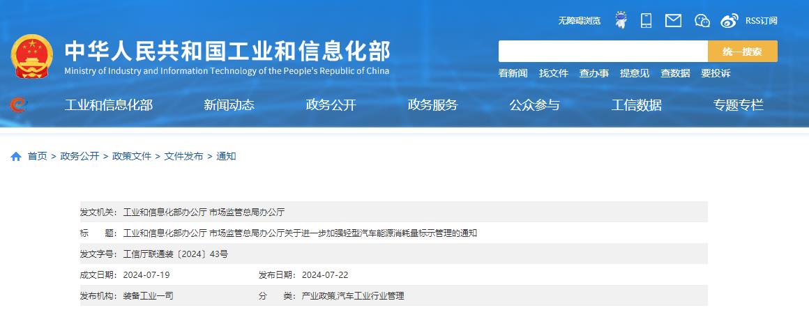 2024年7月22日,工业和信息化部办公厅、市场监管总局办公厅联合发布《关于进一步加强轻型汽车能源消耗量标示管理的通知》,《通知》明确:为进一步规范轻型汽车能源消耗量标示管理,完善汽车能源消耗量公示制度,工业和信息化部、市场监管总局联合部署进一步加强轻型汽车能源消耗量标示管理。要求汽车生产企业或进口汽车经销商应保证其轻型汽车产品在销售时粘贴有轻型汽车能源消耗量标识。能耗标识的内容、格式、材质和粘贴等应符合相应规范;在汽车产品自身以外其它场所使用能耗标识时,可等比例放大或缩小。本通知自发布之日起实施。