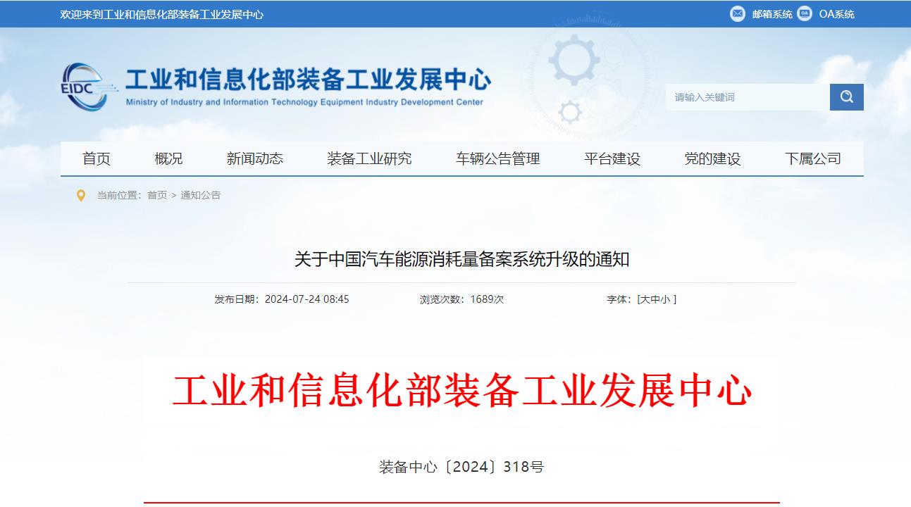 2024年7月24日,工业和信息化部装备工业发展中心发布《关于中国汽车能源消耗量备案系统升级的通知》,《通知》明确:按照相关要求,中国汽车能源消耗量备案系统已完成升级工作,即日起,企业可登录系统按要求开展能耗标识备案工作。