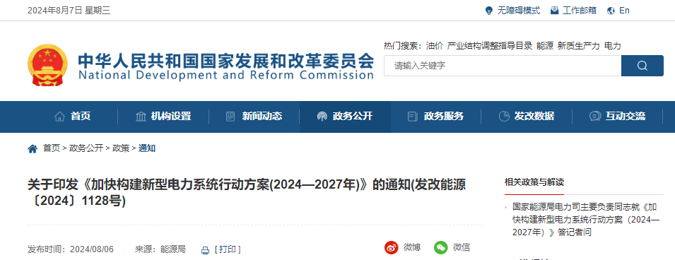 关于印发《加快构建新型电力系统行动方案(2024—2027年)》的通知