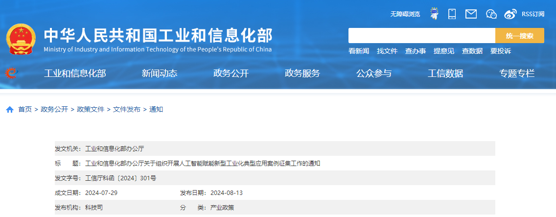 关于组织开展人工智能赋能新型工业化典型应用案例征集工作的通知
