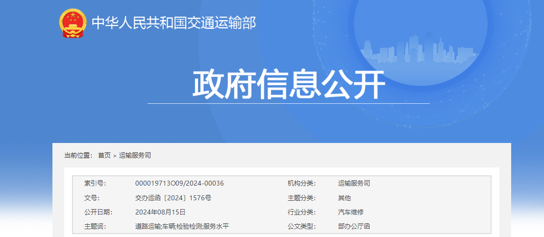 2024年8月15日,交通运输部办公厅发布《关于进一步提升道路运输车辆检验检测服务水平的通知》,《通知》明确:进一步压实道路运输车辆检验检测机构主体责任。