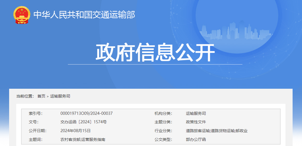 2024年8月15日,交通运输部办公厅发布《农村客货邮运营服务指南(试行)》,《指南》明确: