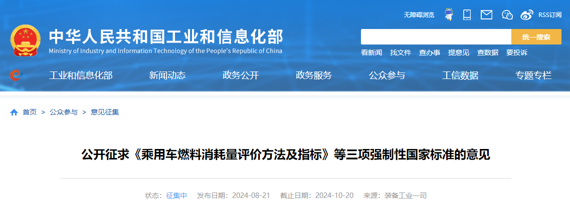 2024年8月21日,工业和信息化部装备工业一司公开征求《乘用车燃料消耗量评价方法及指标》等三项强制性国家标准的意见,其中,