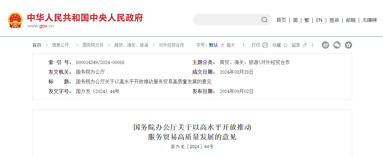 2024年9月2日,国务院办公厅发布《关于以高水平开放推动服务贸易高质量发展的意见》,《意见》明确:推进重点领域创新发展。其中,促进服务贸易与货物贸易融合发展中提到:优化保税监管模式,支持各地区依托综合保税区开展“两头在外”的研发、检测、维修、文物及文化艺术品仓储展示等业务。推动服务贸易与高端制造业融合发展,在生物医药、飞机、汽车、工程机械等领域细化出台专项政策举措,支持制造业企业对外提供具有国际竞争力的专业化、综合性服务。