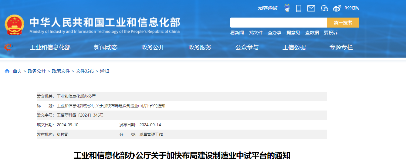 2024年9月14日,工业和信息化部办公厅发布《关于加快布局建设制造业中试平台的通知》,装备制造建设方向,《通知》明确:推动建设整机装备、核心系统及关键零部件产品试验验证线等创新基础设施,提升测试评价、适配验证、极端环境验证等服务供给能力,支撑国家重大技术创新中试验证,推动电力设备、石化通用设备、汽车、机械、航空装备、机器人、仪器仪表、工业母机、新能源智能网联汽车、轨道交通、船舶与海洋工程装备、医疗装备、安全应急装备、环保装备、新型固废处理装备等领域重大成果突破。